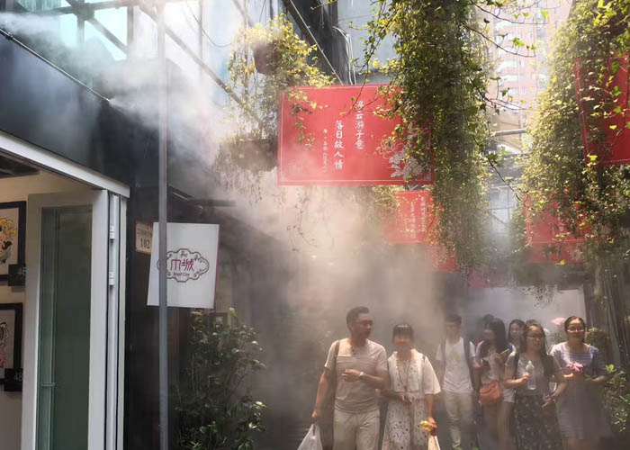 安裝了GREENMAN造霧系統(tǒng)的田子坊弄堂幾乎成了仙境,白霧繚繞,涼風習習,市民和游客置身其中,恍如騰云駕霧,怡然自得,絲毫不覺外面的世界是酷暑難耐。弄堂上方懸掛這經(jīng)典的古詩詞展板,在冷霧的襯托下,更讓游客感受到古人漫步仙境詠詩誦讀的意境。