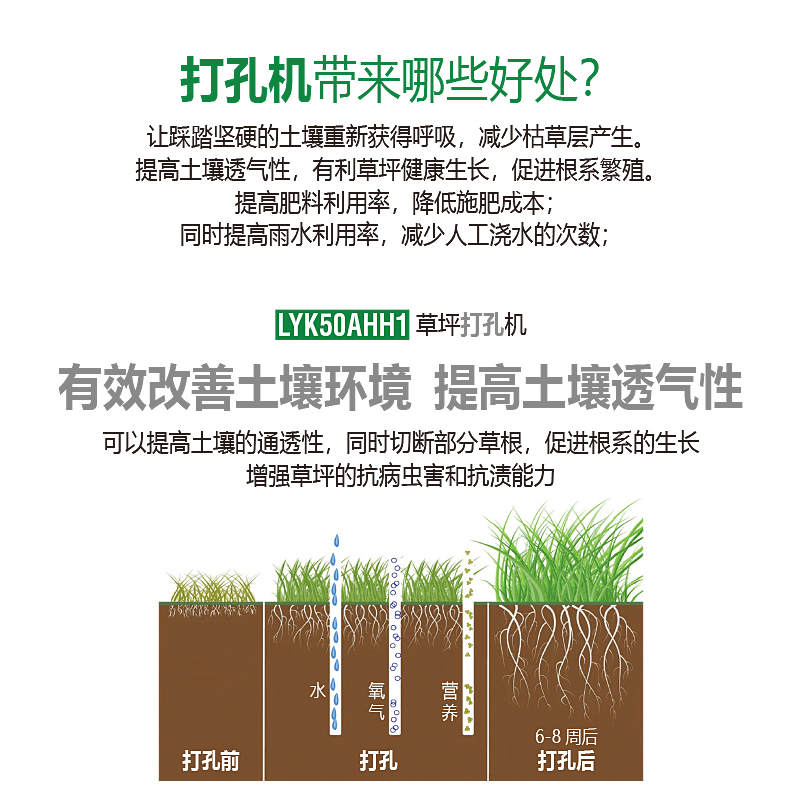 打孔可以切斷部分草根,促進(jìn)根系的生長,增強草坪的抗病蟲害和抗?jié)n能力。