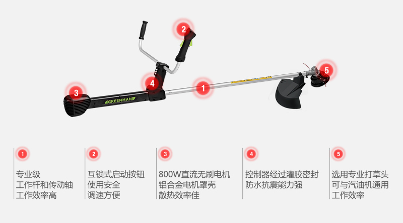 GREENMAN 電動割灌割草機從國內(nèi)綠化管理的實際情況出發(fā),選用800W大功率直流無刷電機和大直徑打草繩。在實現(xiàn)電動化的同時,又能滿足綠化養(yǎng)護的高效率。